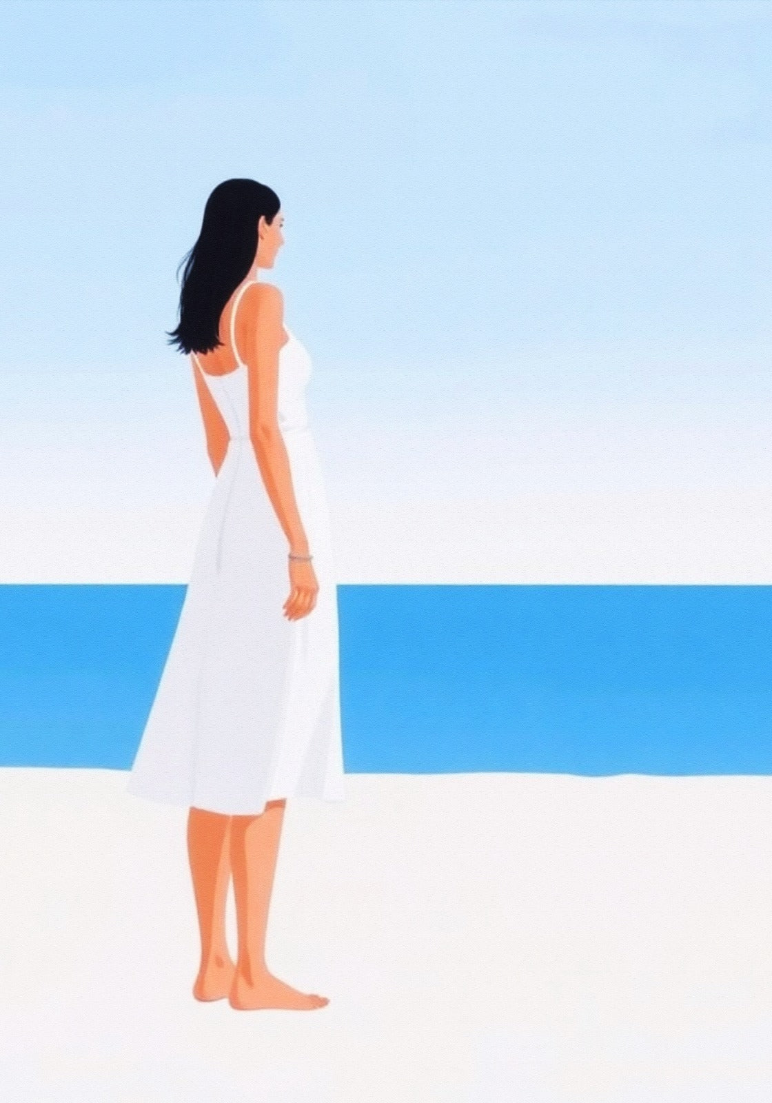 “Attesa sul Mare” cattura un momento di quiete e contemplazione: una figura femminile solitaria osserva l’orizzonte, immersa nel silenzio azzurro del cielo e del mare. Il bianco del suo abito, la pelle ambrata e i toni puri dell’acqua e della sabbia creano un’atmosfera sospesa, luminosa, minimalista. L’opera è un inno alla semplicità e alla bellezza della calma interiore, trasmettendo una sensazione di pace e libertà.