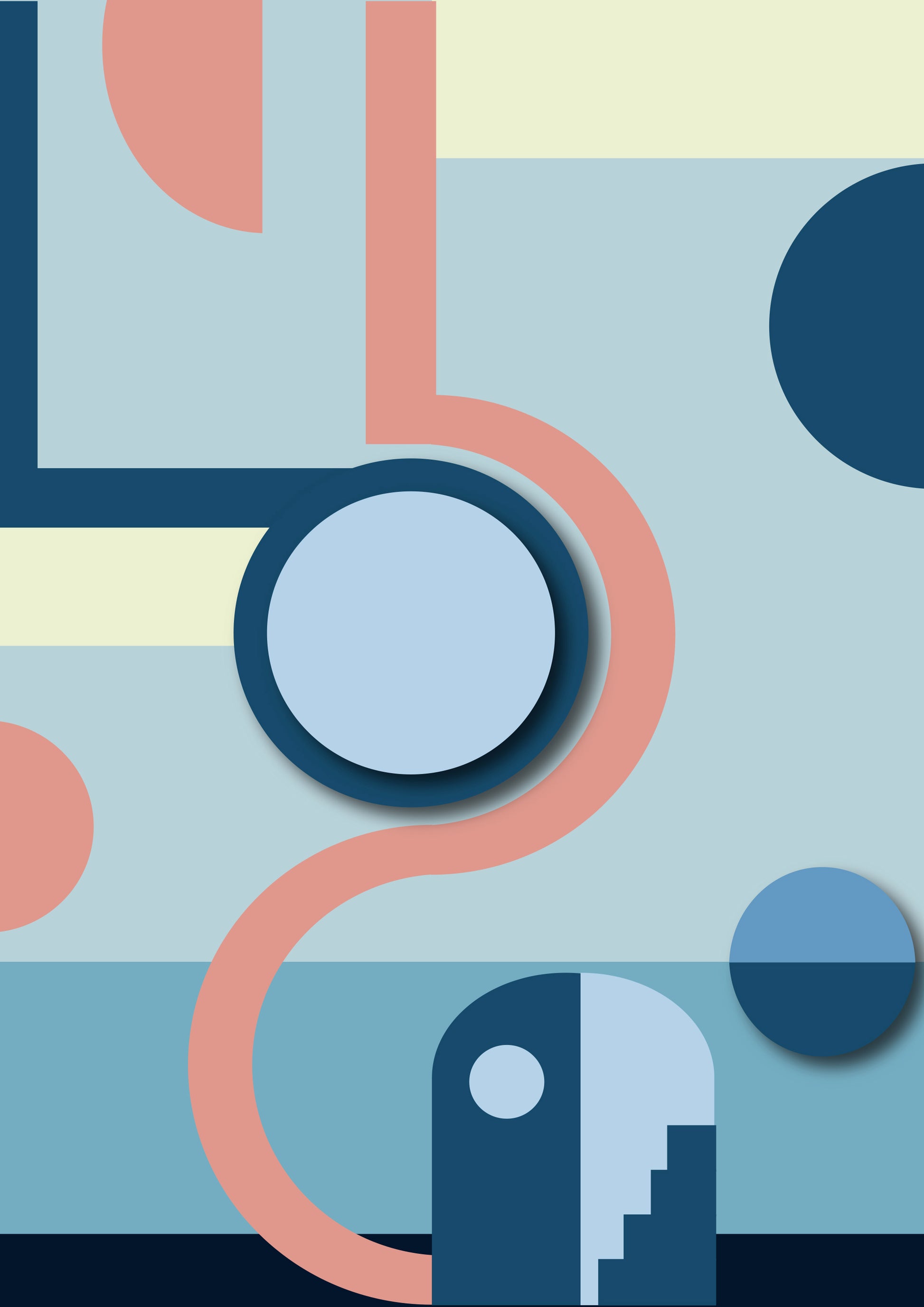 Stampa artistica geometrica raffigurante linee, cerchi blu e forme geometriche. Il poster dallo stile moderno si adatta bene agli interni contemporanei.