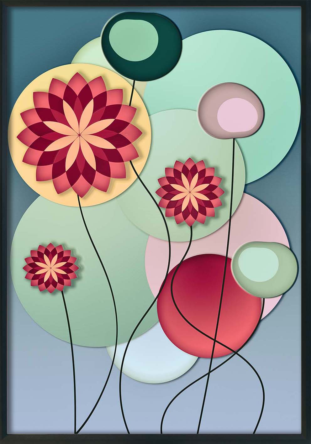 Poster per interni con linee e forme geometriche colorate che disegnano un giardino con fiori. Stile minimal e contemporaneo ideale per l'interior design dei tuoi ambienti.