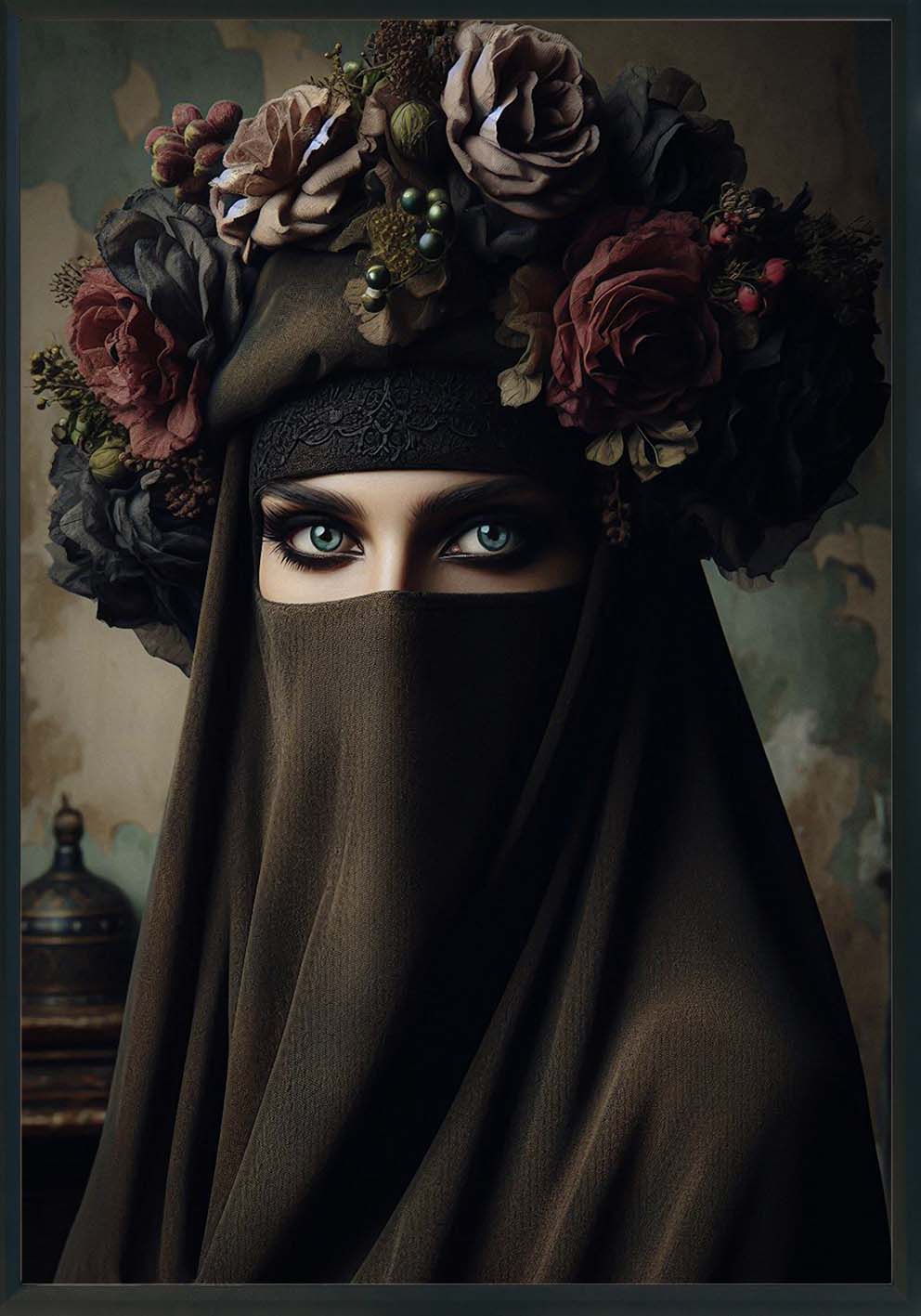 Questa opera è l'incontro perfetto tra mistero e delicatezza: una donna velata, rivelata solo dagli occhi intensi e da una corona di fiori che sboccia in armonia con l’ambiente.