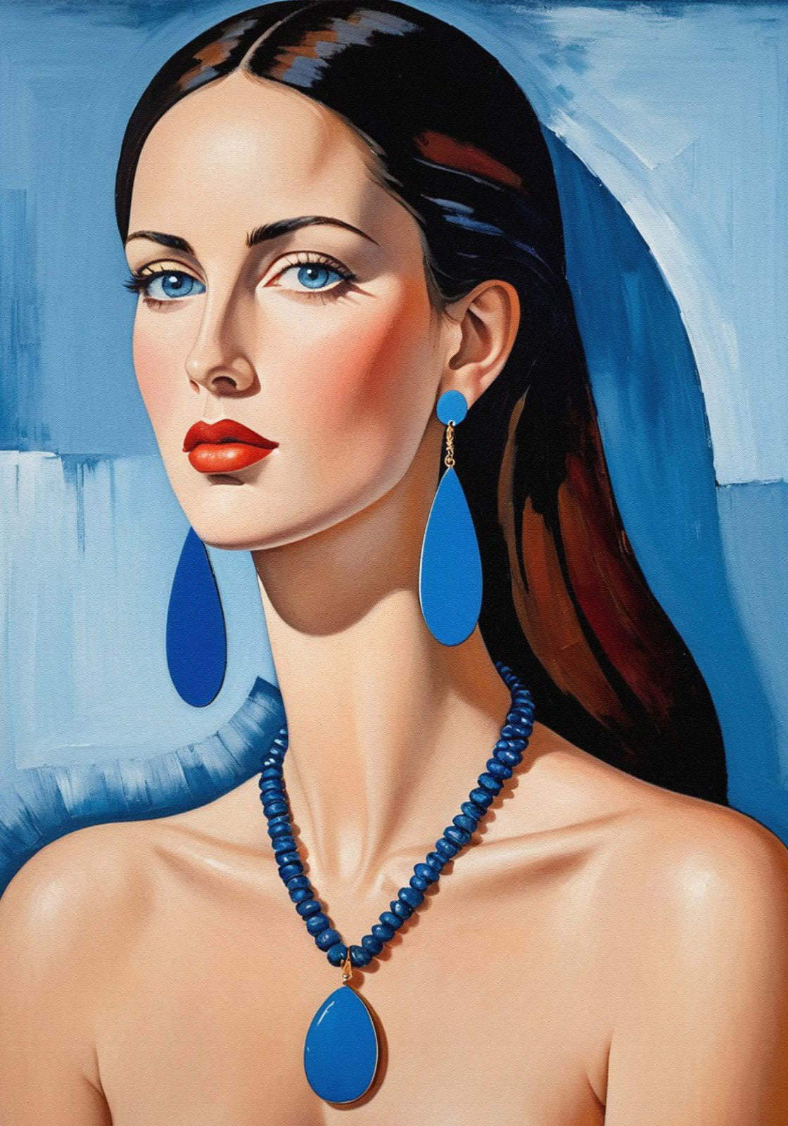 “Eleganza Cobalto” è un ritratto sofisticato e magnetico che celebra la femminilità attraverso forme stilizzate e una palette cromatica decisa. La figura centrale, una donna dallo sguardo fiero e penetrante, è impreziosita da gioielli vistosi in blu cobalto che si fondono armoniosamente con lo sfondo astratto nei toni del blu e dell’azzurro. L’opera richiama l’estetica anni ’70 e la ritrattistica glamour reinterpretata in chiave moderna, trasmettendo una forte identità visiva fatta di eleganza, determinazione e sensualità discreta.