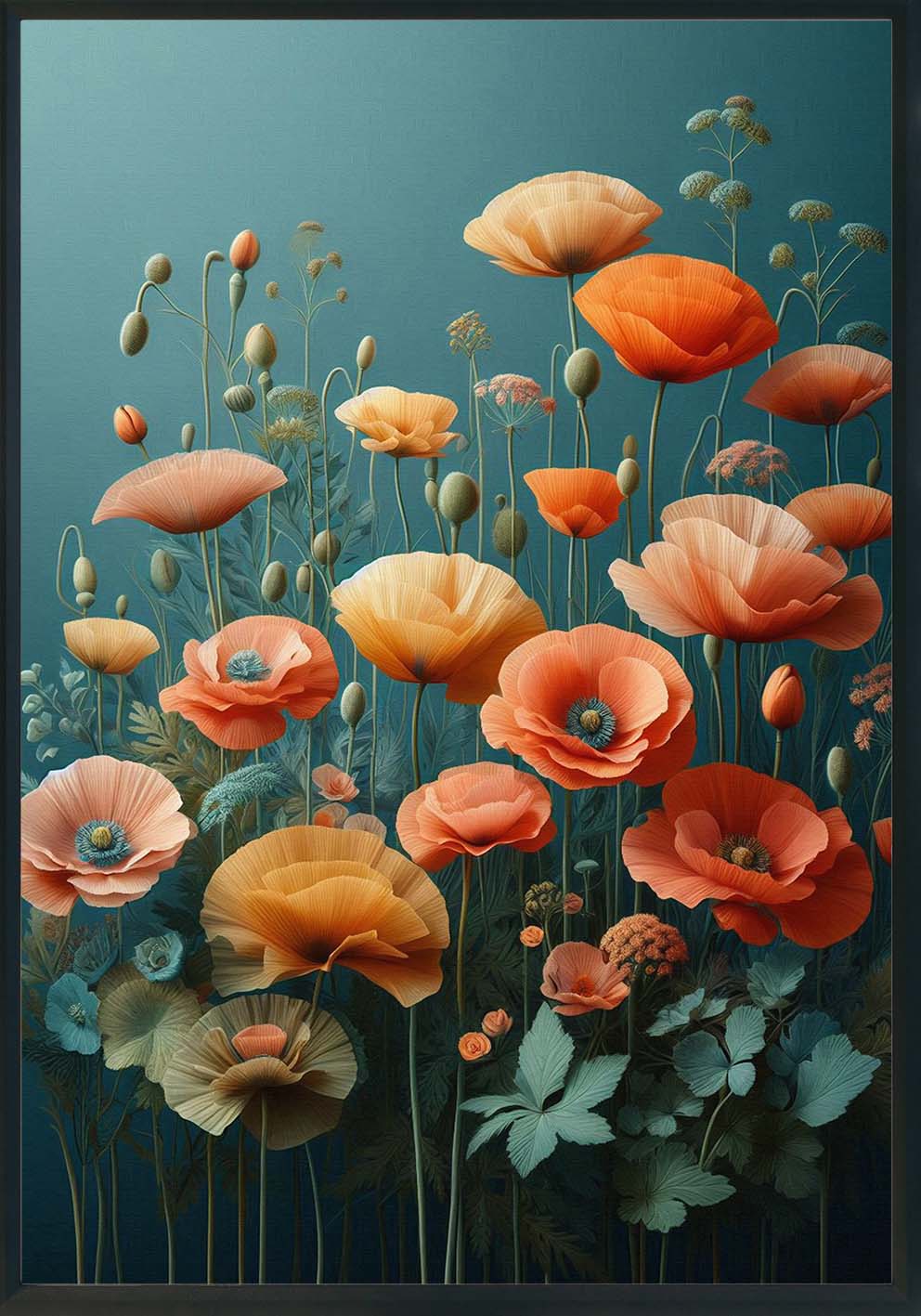 Un'elegante e suggestiva rappresentazione di papaveri dai toni caldi dell'arancione e del corallo, immersi in uno sfondo blu intenso che esalta la delicatezza dei fiori. La composizione floreale è ricca di dettagli, con foglie e steli che creano un affascinante gioco di texture e profondità.