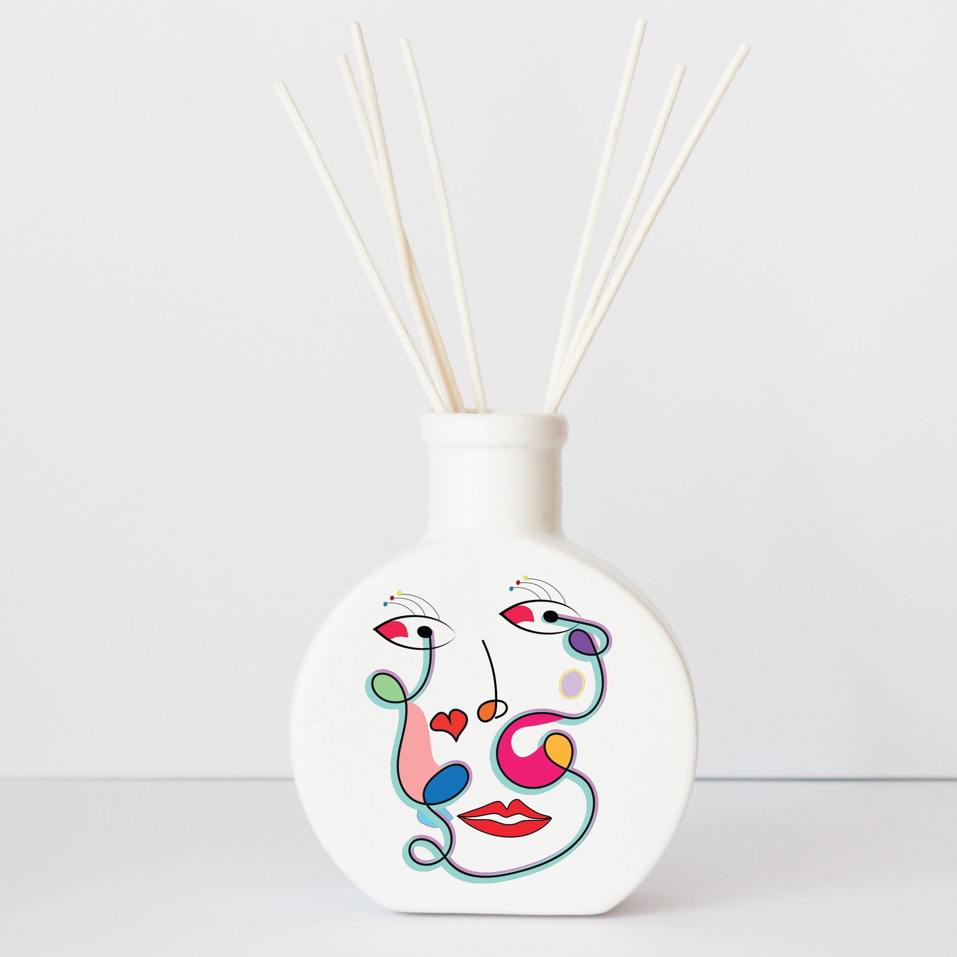 Sul fronte del diffusore è raffigurato un volto stilizzato, realizzato con linee sinuose e continue che delineano occhi, naso, labbra e tratti del viso in modo creativo e non convenzionale. I colori vivaci — come rosso, fucsia, verde, blu, giallo e viola — sono utilizzati in modo giocoso per accentuare le forme, creando un contrasto raffinato con il bianco puro della ceramica.