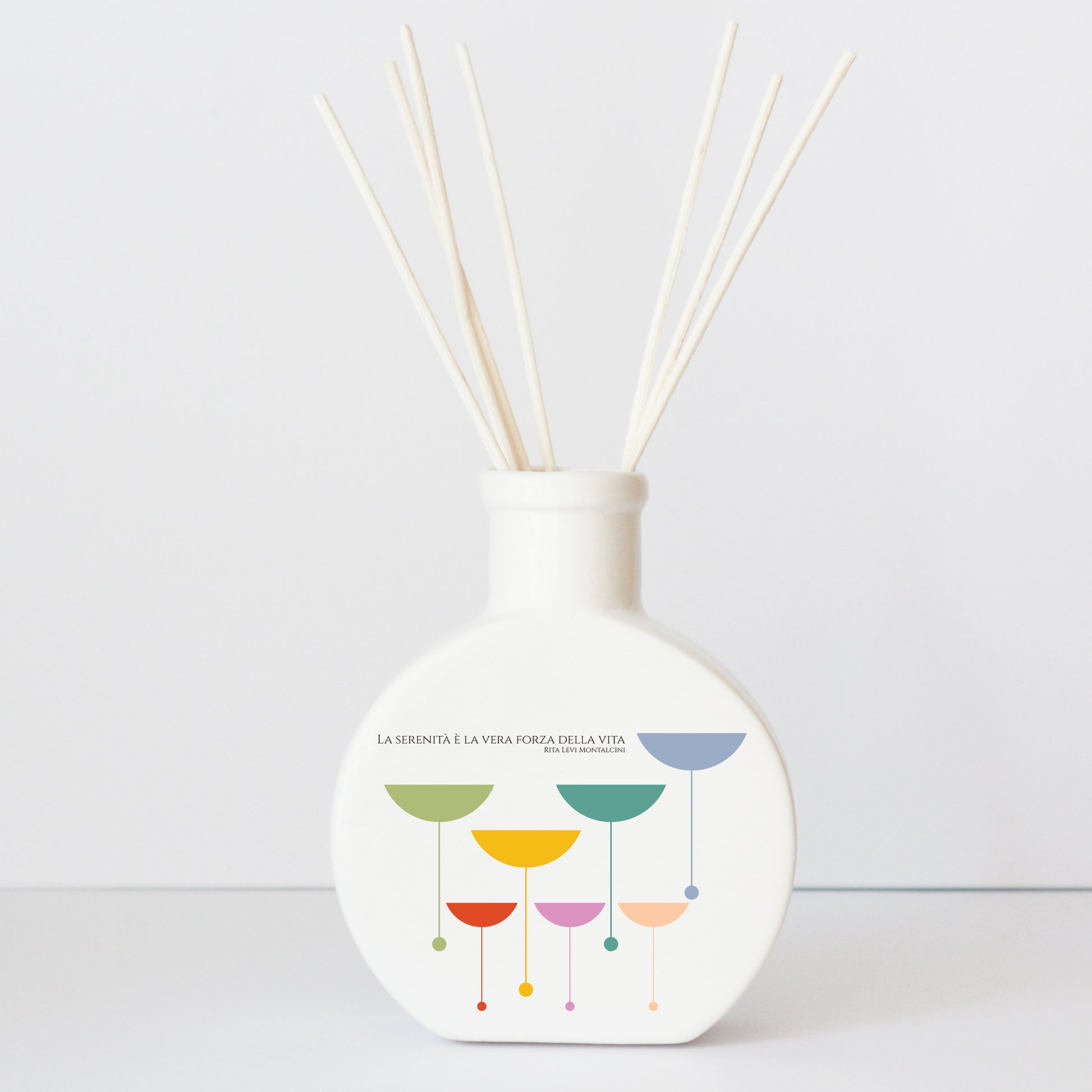Un raffinato profumatore d’ambiente in ceramica realizzato a mano da mastri ceramisti italiani. Ogni pezzo è unico e decorato con una grafica d’autore ispirata all’arte contemporanea minimal, che rappresenta un insieme di forme geometriche colorate con una frase motivazionale sulla serenità.