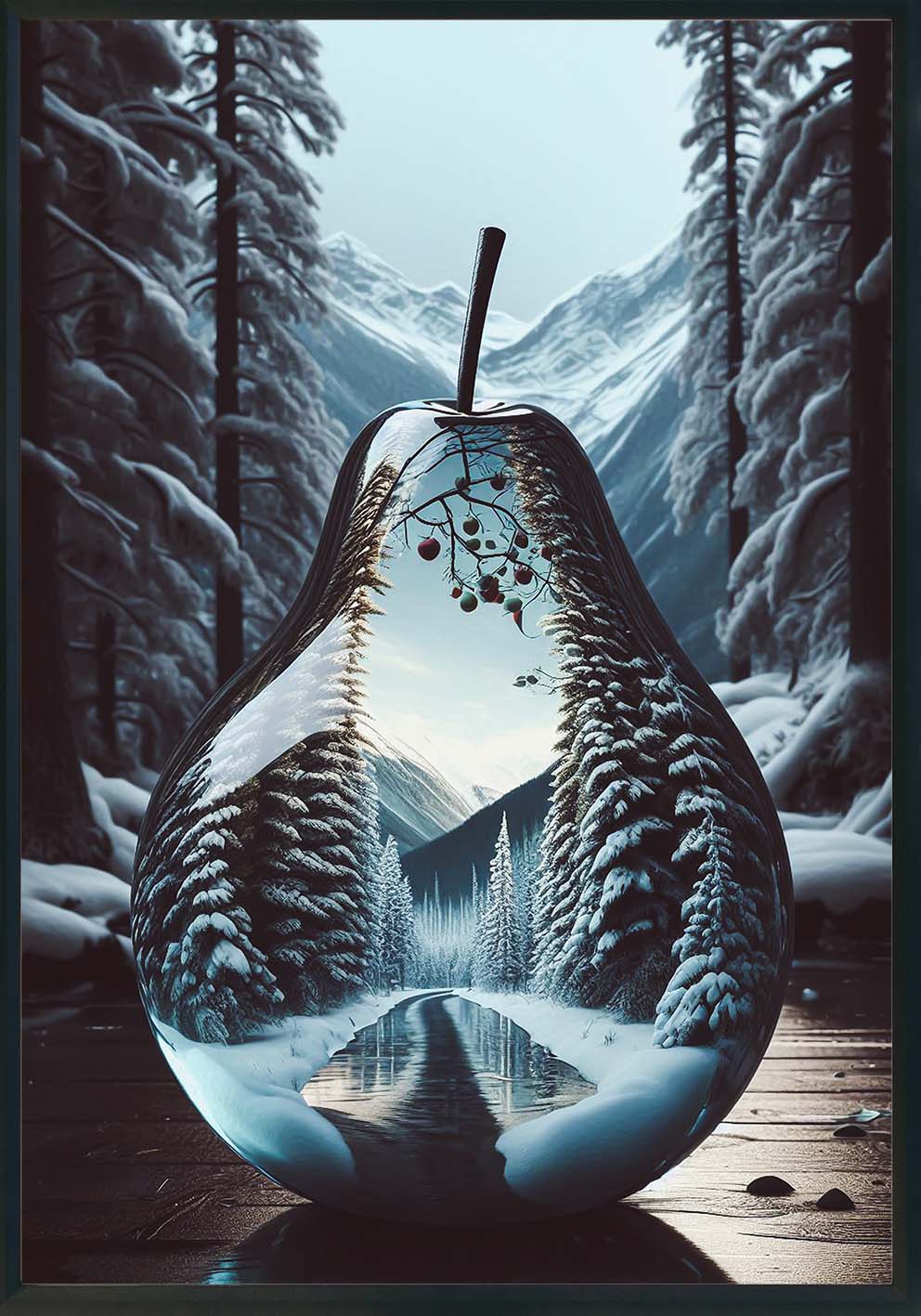 “Pera d’Inverno” è un quadro dallo stile surreale e poetico, che cattura la bellezza silenziosa dei paesaggi invernali. All’interno di una pera lucida e perfettamente sagomata, si riflette un bosco innevato attraversato da un ruscello ghiacciato e incorniciato da abeti imbiancati. Sullo sfondo, le montagne completano l’atmosfera incantata.