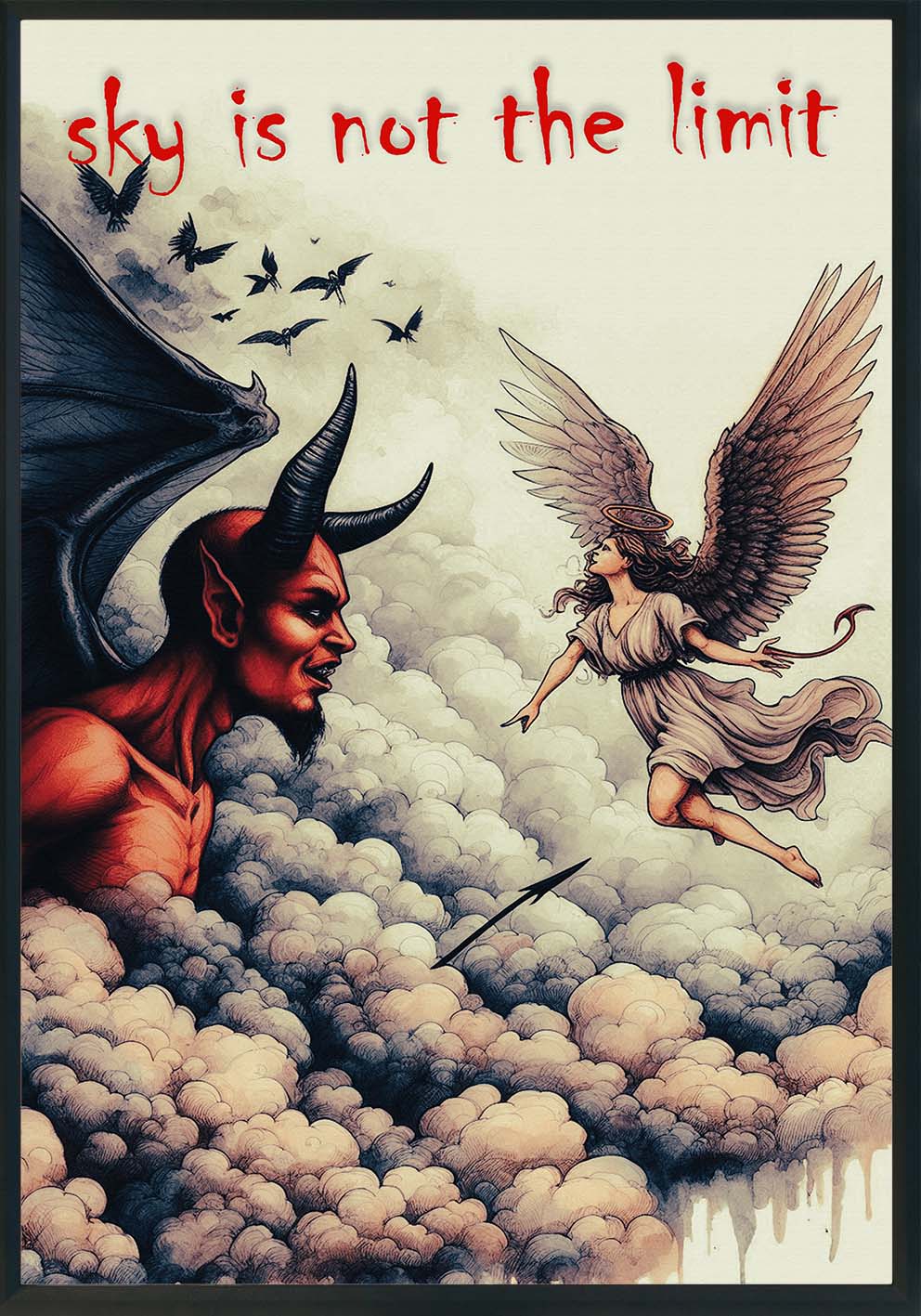 “Sky Is Not the Limit” è un potente quadro dal linguaggio visivo diretto e provocatorio. Un angelo e un demone si fronteggiano tra le nuvole in una scena surreale che mescola spiritualità, simbolismo e ironia. L’iconico messaggio in rosso, “Sky is not the limit”, incarna un’esortazione audace a superare ogni confine, morale o mentale. L'estetica richiama lo stile tattoo e dark fantasy, perfetto per chi ama arredare con carattere e profondità.