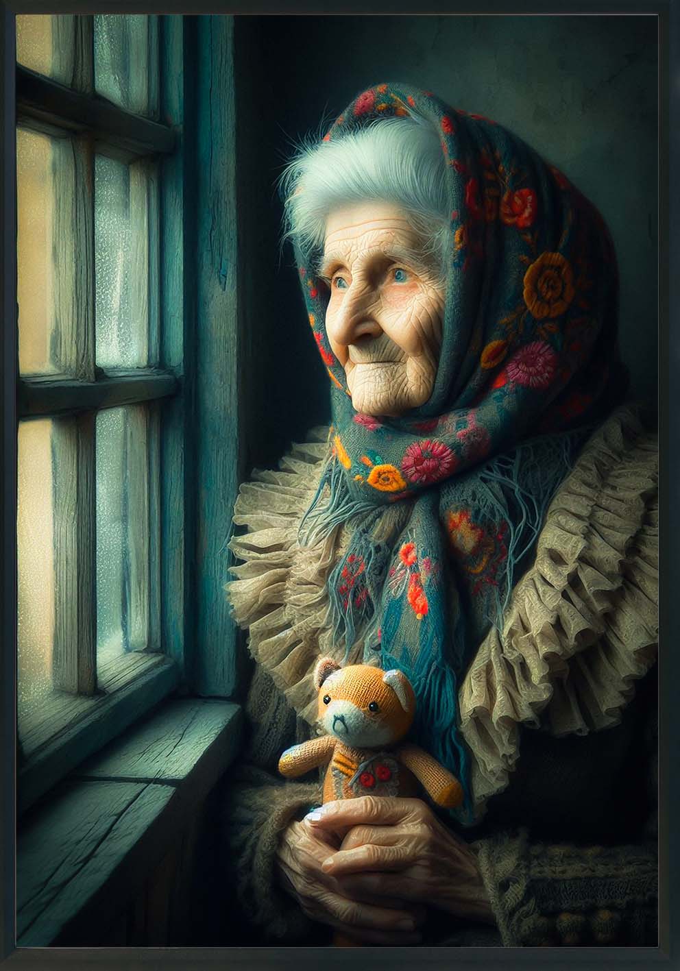 Un’immagine intima e delicata, capace di evocare emozioni profonde. "Sguardo nel Tempo" ritrae una donna anziana seduta accanto a una finestra, immersa nei propri pensieri. Tra le mani stringe un orsacchiotto, simbolo di memoria e affetto, mentre il suo sguardo assorto si perde oltre il vetro, come a cercare ricordi lontani.