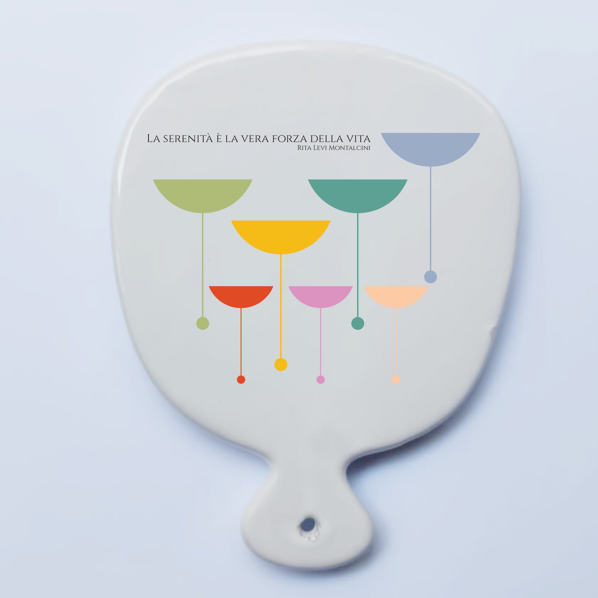 Il tagliere presenta segni grafici colorati e una citazione di Rita Levi Montalcini sulla forza della vita.