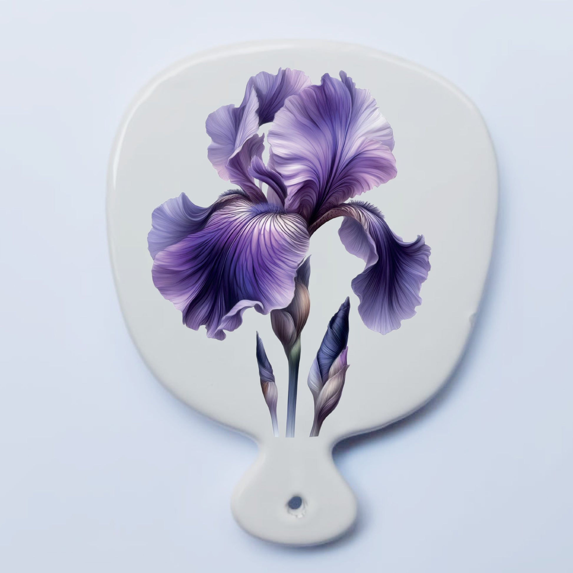 La decorazione rappresenta un elegante fiore di iris nei toni del viola e del lilla, con petali morbidi e sinuosi che creano un effetto molto realistico e raffinato. Alla base si vedono anche i boccioli in varie fasi di apertura, dipinti con sfumature delicate che spaziano dal verde al viola.